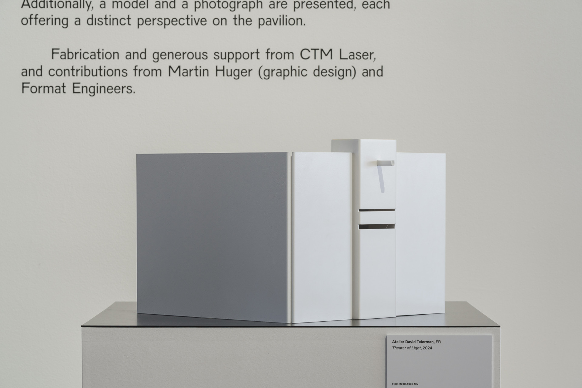 Theater of Light is presented through a steel fragment and a scale model. The project explores a one-room structure made of prefabricated steel panels, assembled on site, shaping light and perception through minimal form.